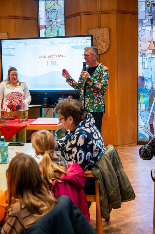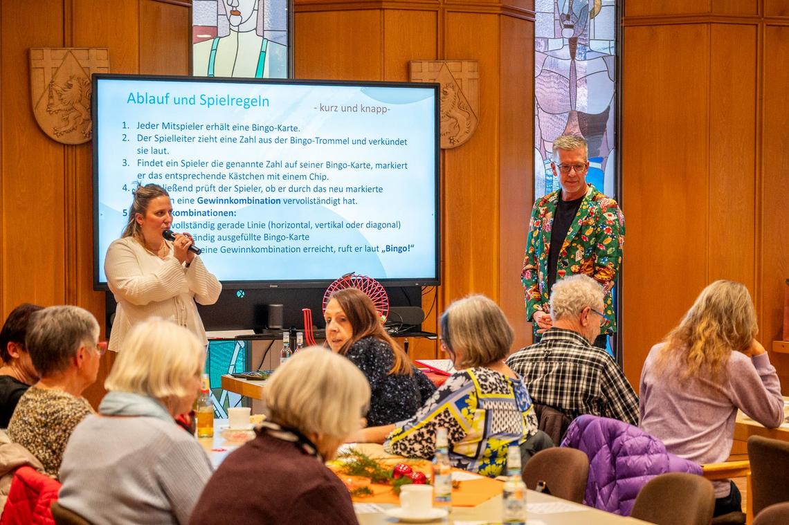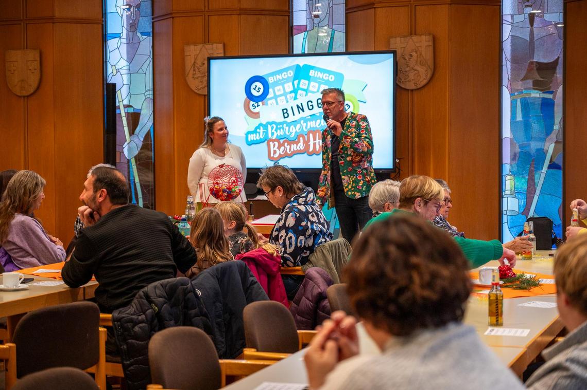 Durch das Programm führte Bürgermeister Bernd Huf, der mit viel Humor die Bingo-Zahlen vorlas und so für eine unterhaltsame Atmosphäre sorgte. Unterstützt wurde er von Paula Füssenich, Mitarbeiterin für Seniorenarbeit, welche die Bingo-Trommel bediente.