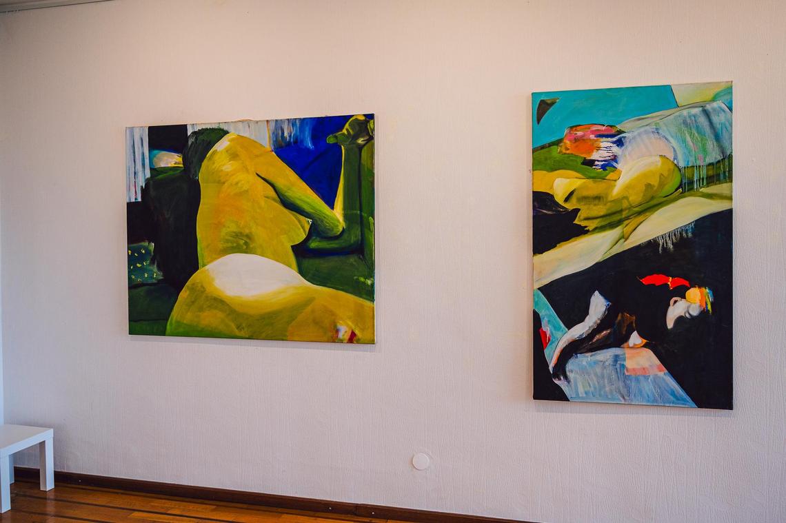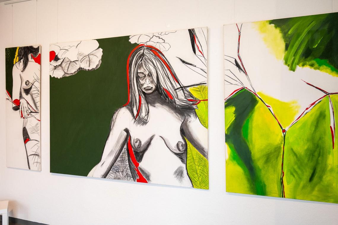 Im vorderen Raum der Artotheke erwartet die Besucherinnen und Besucher ein besonderer Blickfang: ein großformatiges, dreiteiliges Gemälde auf Leinwand, das die Künstlerin selbst zeigt und einen eindrucksvollen Auftakt zur Ausstellung bildet.