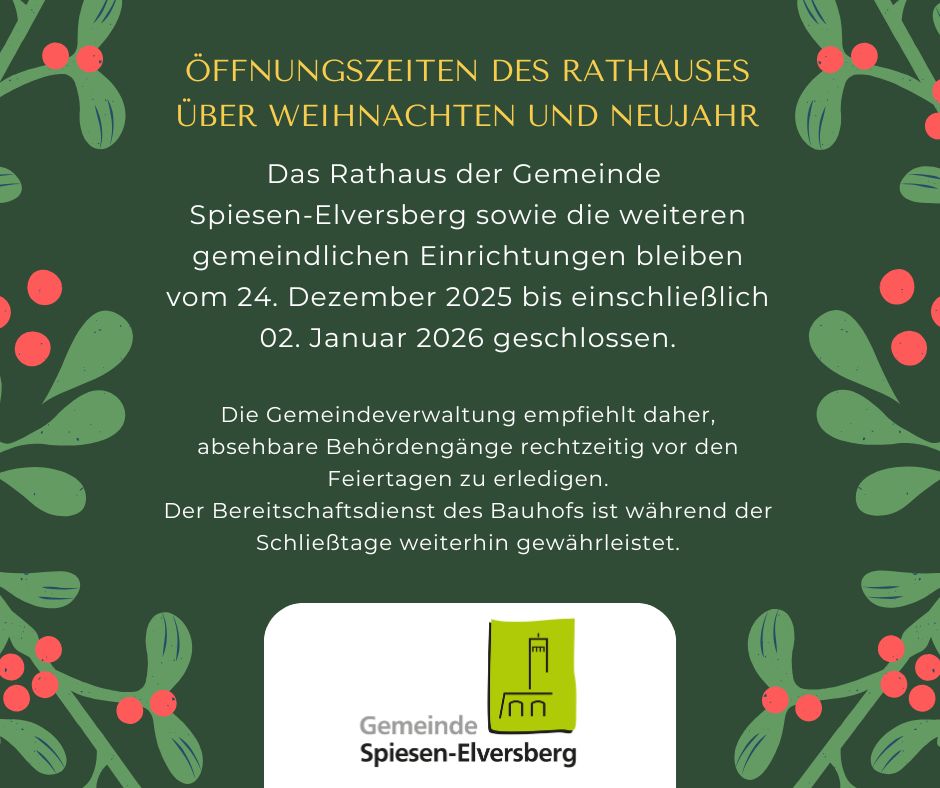 Das Rathaus der Gemeinde Spiesen-Elversberg sowie die weiteren gemeindlichen Einrichtungen bleiben vom 24. Dezember 2025 bis einschließlich 02. Januar 2026 geschlossen. Die Gemeindeverwaltung empfiehlt daher, absehbare Behördengänge rechtzeitig vor den Feiertagen zu erledigen.