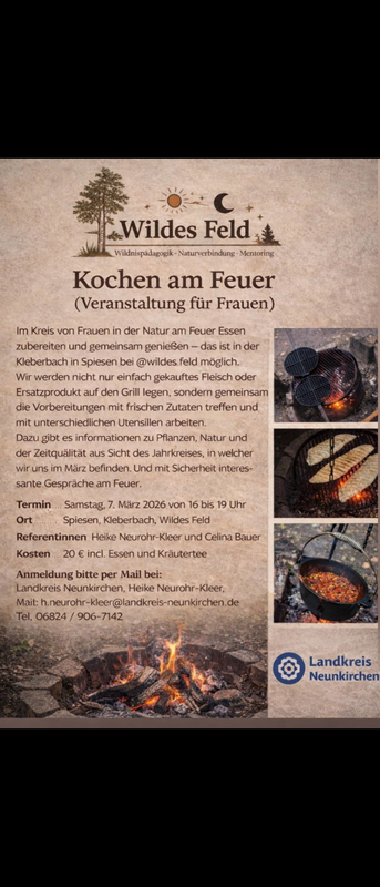 Im Kreis von Frauen in der Natur am Feuer Essen zubereiten und gemeinsam genießen – das ist in der Kleberbach in Spiesen bei @wildes.feld möglich. Wir werden nicht nur einfach gekauftes Fleisch oder Ersatzprodukt auf den Grill legen, sondern gemeinsam die Vorbereitungen mit frischen Zutaten treffen und mit unterschiedlichen Utensilien arbeiten. Dazu gibt es Informationen zu Pflanzen, Natur und der Zeitqualität aus Sicht des Jahrkreises, in welcher wir uns im März befinden. Und mit Sicherheit interessante Gespräche am Feuer.
