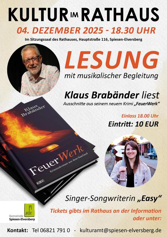 Am Donnerstag, den 4. Dezember 2025, präsentiert Klaus Brabänder Auszüge aus seinem neuen Krimi „FeuerWerk“. Der bekannte Autor ist für seine spannenden und humorvollen Geschichten mit regionalem Bezug weit über das Saarland hinaus bekannt.